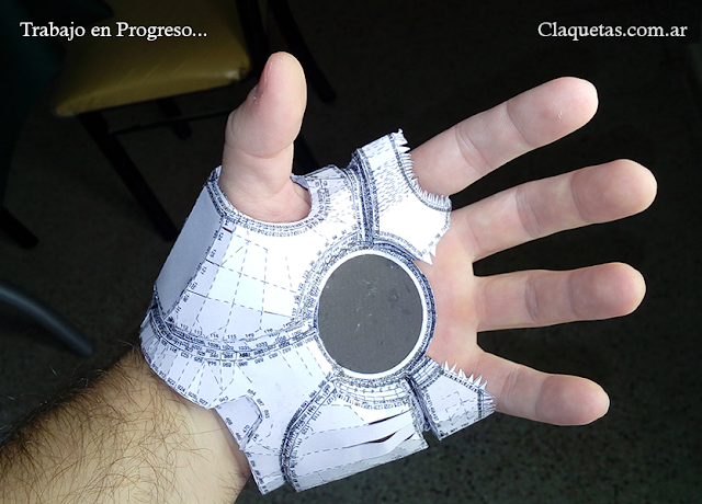 La palma no es nada fácil pero tampoco imposible. Diría que en un par de días ya se puede tener armada la palma completa. En cuanto a la escala es un poco complicado porque si tomamos la medida de nuestra muñeca para la circunferencia de la palma no nos entrará la mano ya que ésta es más grande que la muñeca, el tema es que así como está ya se ve grande, o en el tamaño justo me atrevería a decir. Para ponérmela tuve que esconder el dedo pulgar, aún así creo que hacer la palma más grande hubiera sido un error…
