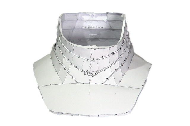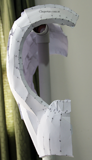 En esta parte tengo que confesar que me olvide de tomar las medidas de mi cuerpo y ajustar la escala. No me gusta mucho porque me parece que esta unos 5 centímetros grande. Seguramente tendré que volver a hacer el trabajo, pero estaba pensando que hay que buscar una forma para ponerse y sacarse el cuello; así que posiblemente analice solo con esta parte la posibilidad de hacerla con Goma Eva, pero no se que hacer aún…