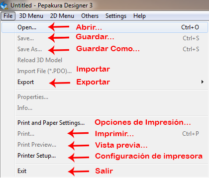 En la barra de menús damos clic en “File” y se va a desplegar el siguiente menú, el cual me tomé la libertad de traducirla al español, y vamos a dar clic en “Abrir” (También podemos dar clic al icono de la carpeta abierta en la barra de accesos directos)