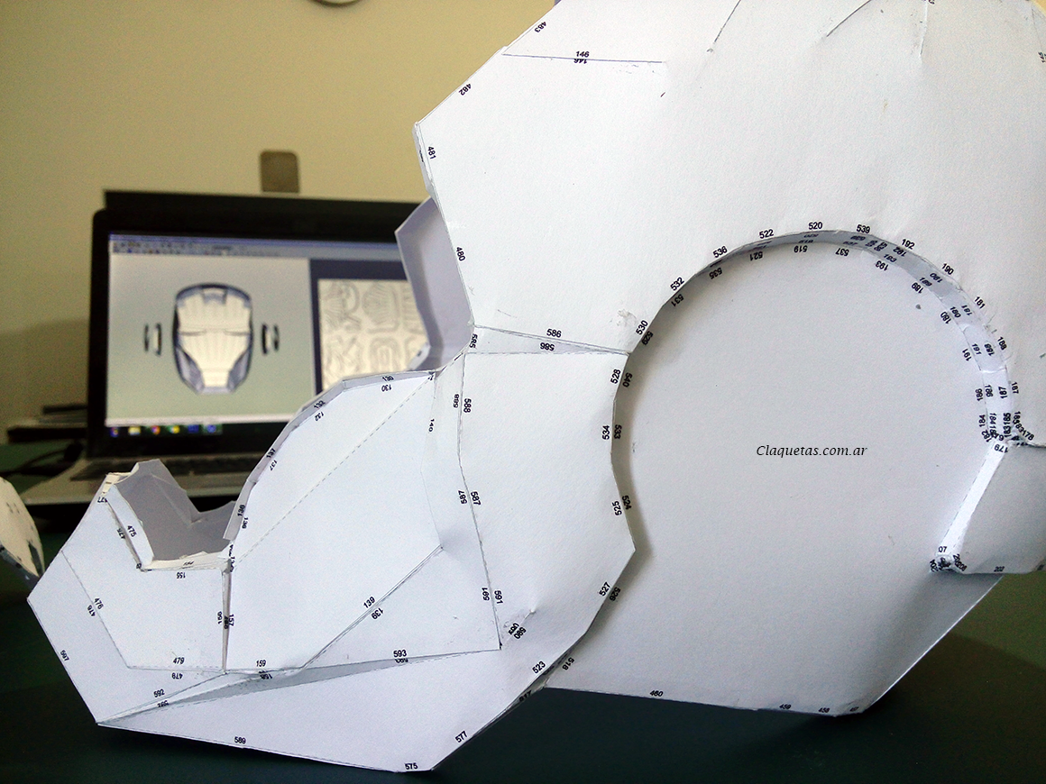 Ahora, si lo han hecho bien, el Casco no debería entrarles; porque si les entra fácil quiere decir que lo han hecho muy grande y les va a quedar desproporcionado con el resto del traje. Si no les entra (y se lo quieren probar), entonces pueden sacarle la cinta de papel que sostiene la quijada y ponérselo para probarlo, pero ojo! recuerden que esto esta hecho con papel y se puede romper muy fácil. Así que hay que manipularlo con mucho cuidado.