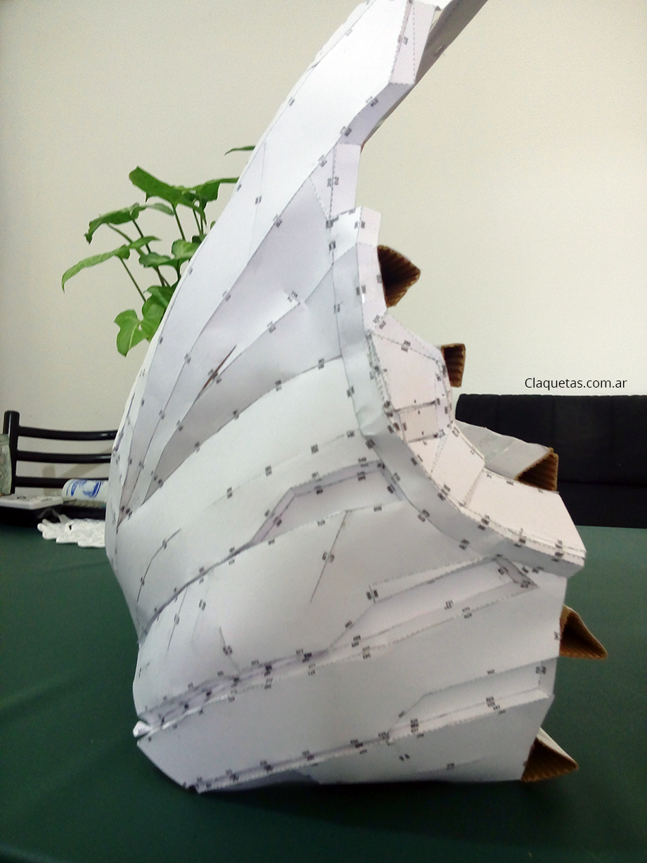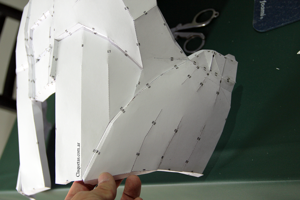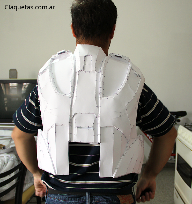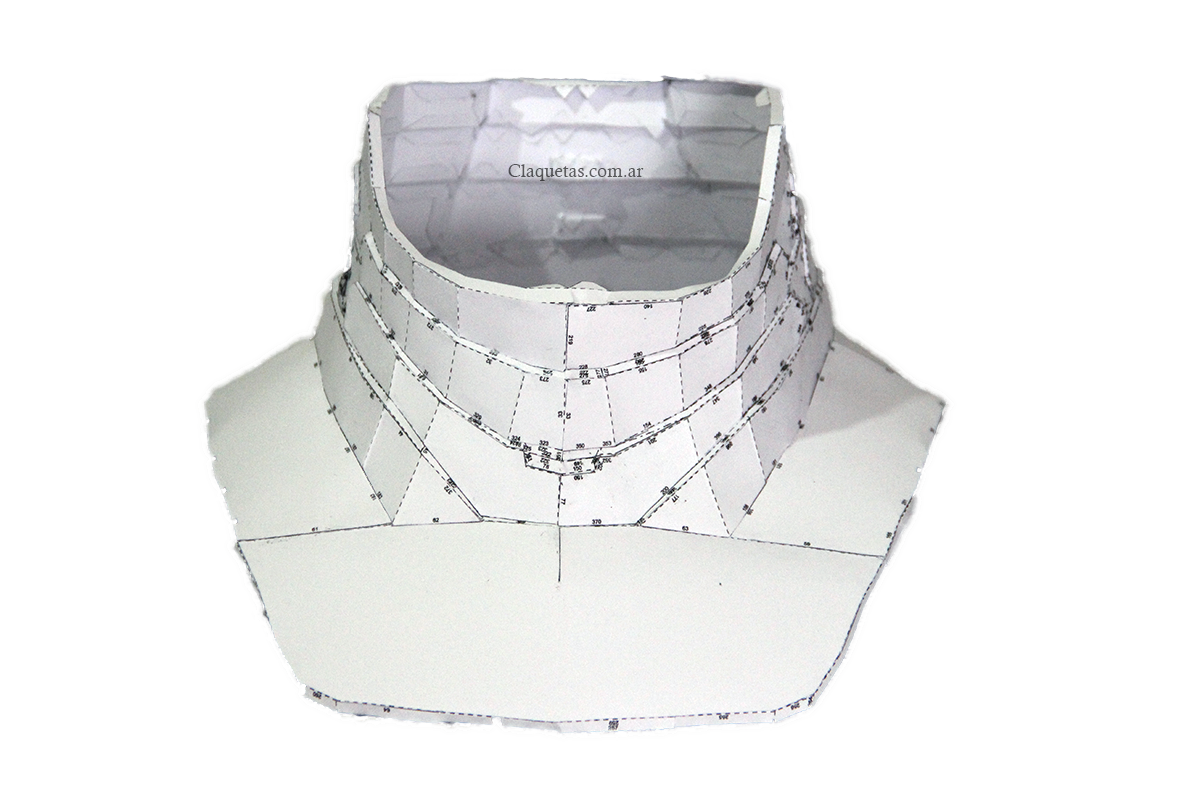 En esta parte tengo que confesar que me olvide de tomar las medidas de mi cuerpo y ajustar la escala. No me gusta mucho porque me parece que esta unos 5 centímetros grande. Seguramente tendré que volver a hacer el trabajo, pero estaba pensando que hay que buscar una forma para ponerse y sacarse el cuello; así que posiblemente analice solo con esta parte la posibilidad de hacerla con Goma Eva, pero no se que hacer aún…